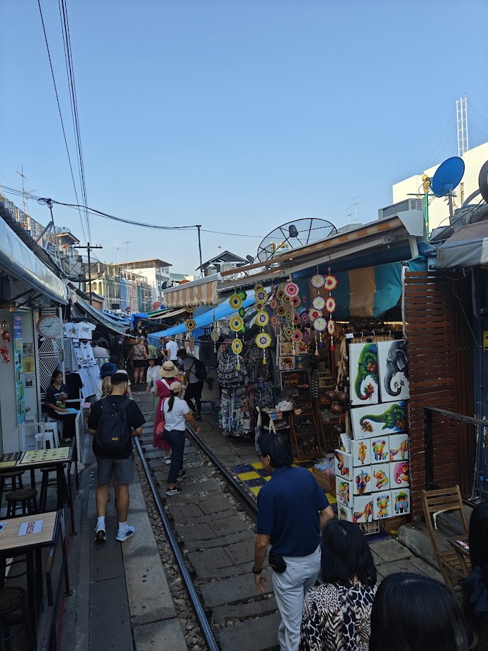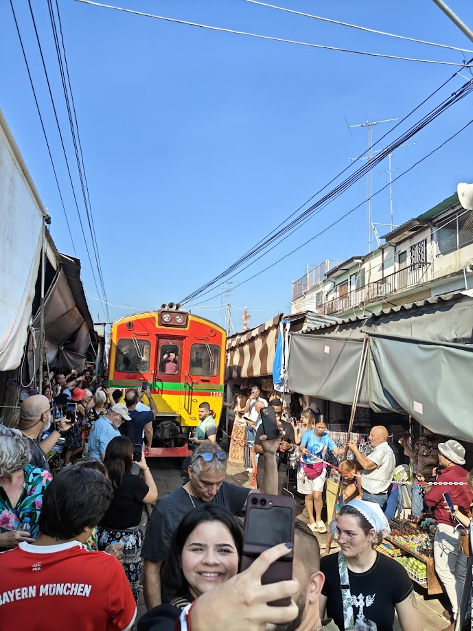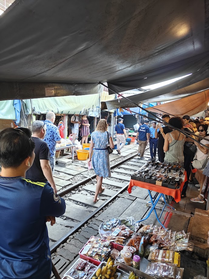 We woke up the next morning in Bangkok. But we would not be staying there much longer. We all got up extra early in order to stop at the famous Train Market. We were warned ahead of time by Rio that the people in the stalls don’t really like tourists. He explained that we come to take our videos and photos, stepping over everything, causing havoc, and blindly walking in front of the train, etc. Picture clueless stampedes of migrating wildebeest charging through a market while a train barrels through it. But they’re all holding phones and talking to their Instagram followers in live Reels. He also suggested that all the vendors know we are not there to buy anything, and that mostly we do not.