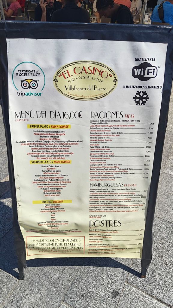 We ate at Restaurante El Casino. The menu del Dia has lots of options to choose from. We spent €32. We had Two salads, two mains, two desserts, bottle of wine, one Coke Zero.