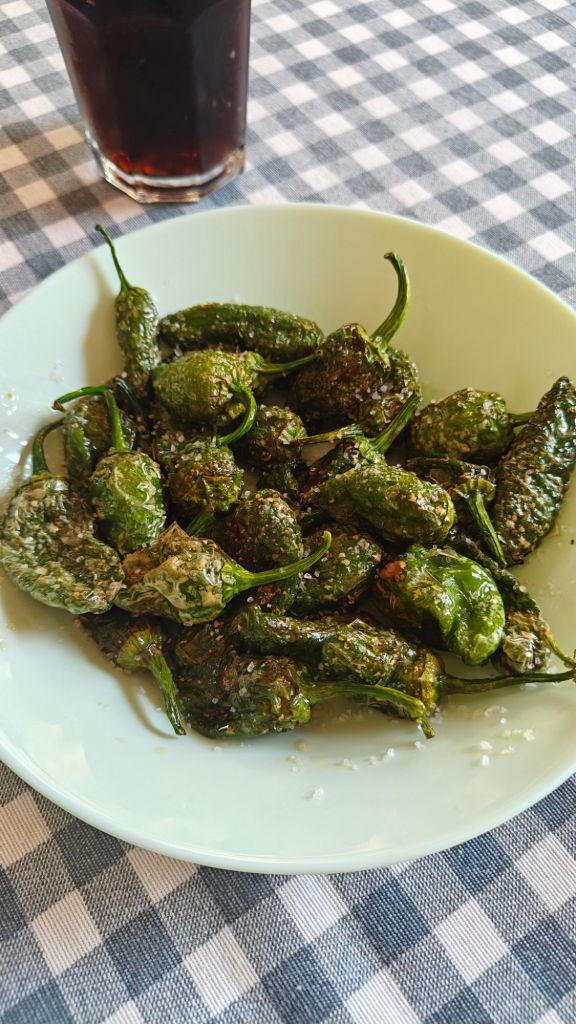 We are here in Sarria and we just had supper at the most lovely restaurant just across the road and down a bit from our albergue. It was divine. La Salina. The woman was so lovely and the food was amazing! We ordered Padrón peppers. I heard over the years that every once in a while you will get one that’s spicy. On three Caminos that did not happen. Hello, SPICY PADRÓN PEPPER!! Holy cow! I had two that were so hot, both my lips and my tongue were sore for several minutes. Spicy Padróns really do exist!