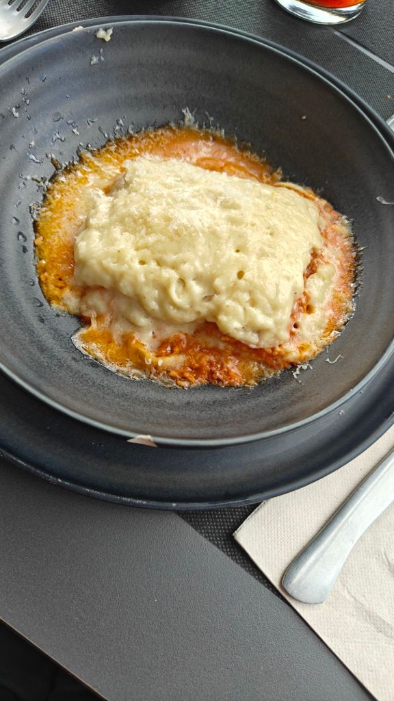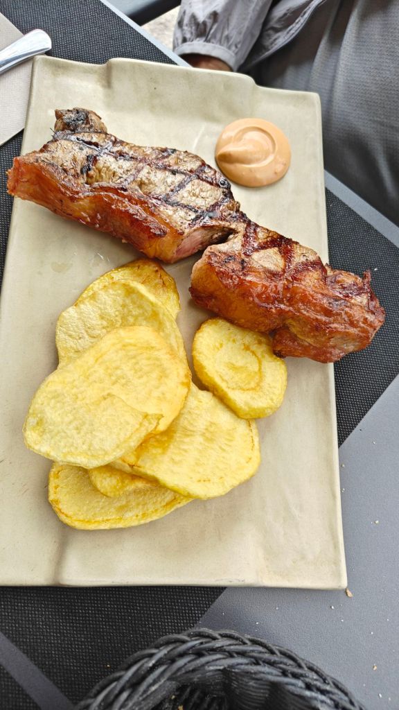 The sun is shining down on our clothes on the line and we’re chilling after having had a marvelous supper at Ultreia Restaurante and Albergue… which is located a few blocks away on the main drag. We ate there in 2019 and I was adamant about going there again. They have traditional Galician food, but their Italian is absolutely spectacular.
